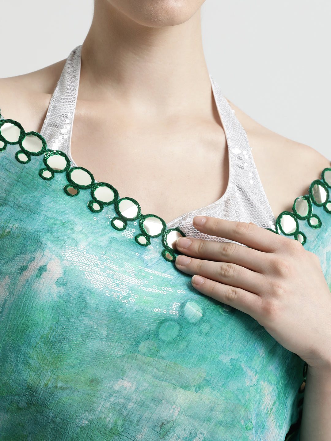 Be glam-ready in our Pure Georgette Patola Mirror Green Tie-Dye Saree. It has tie-dye prints and circular patola mirror work on the border.