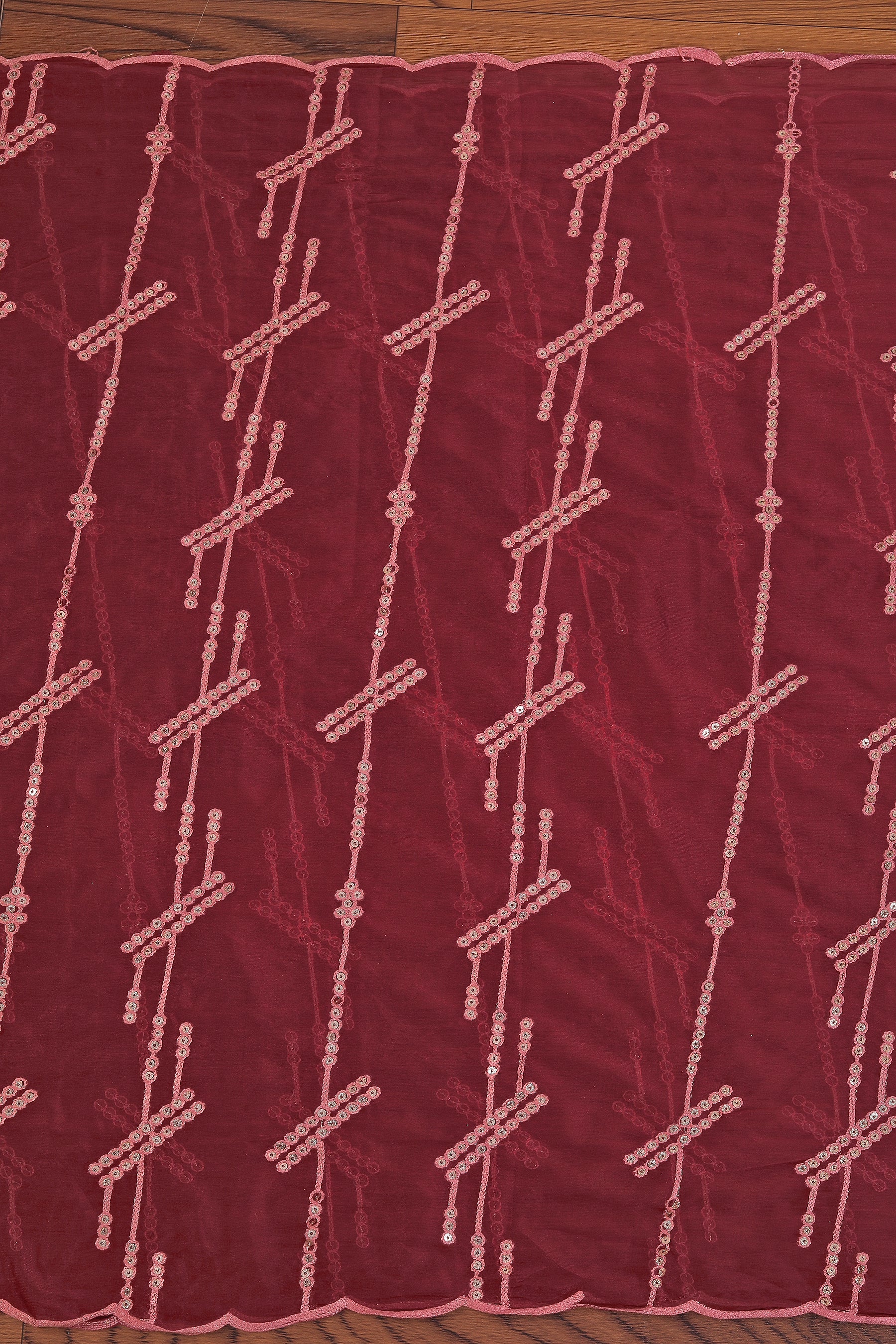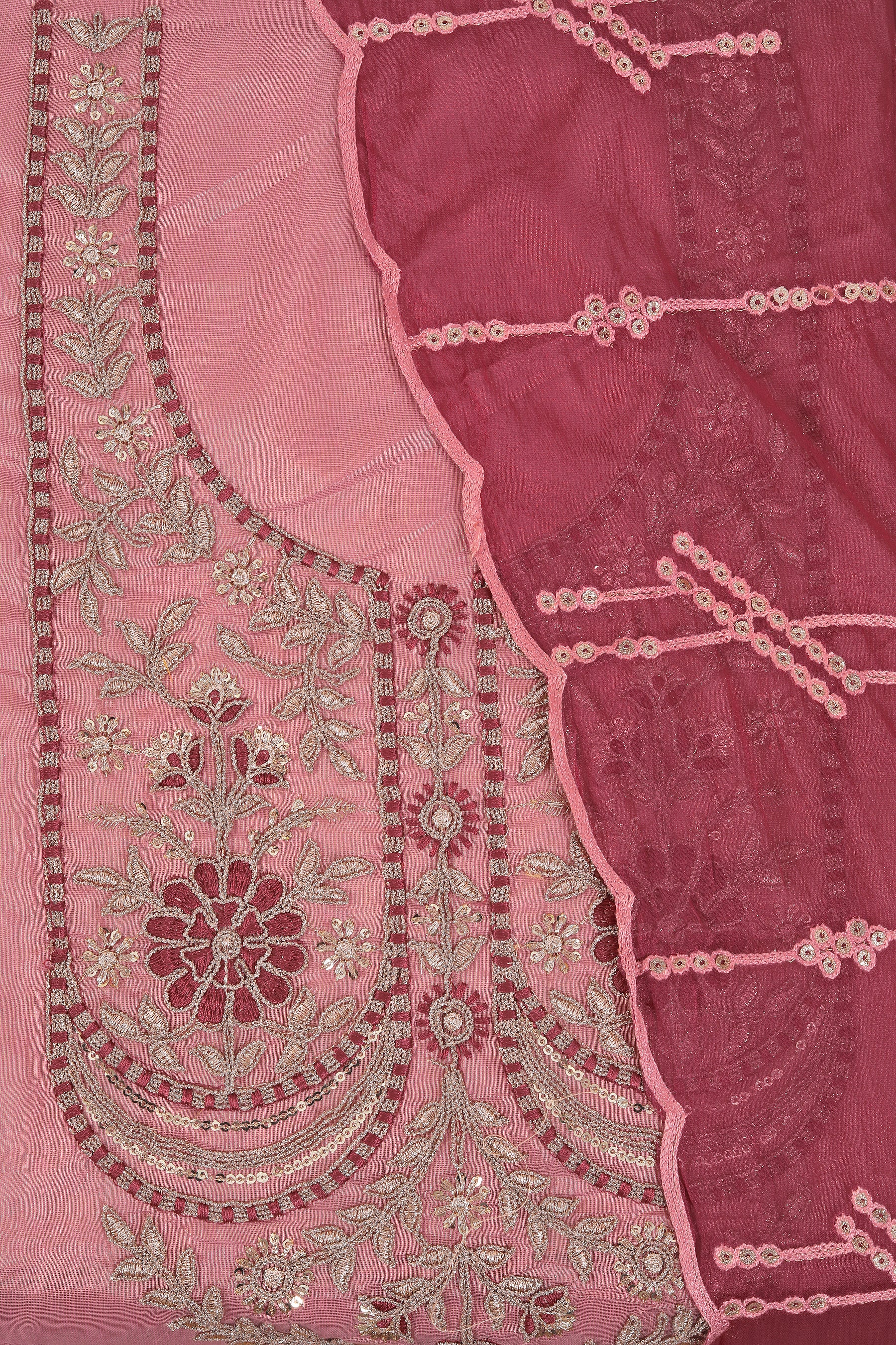 This Pink Zari Embroidered Silk Blend Dress Material With Embellished Dupatta is a charming style. The kurta has silk blend fabric with zari embroidered work. It comes with matching pants and an embroidered dupatta.