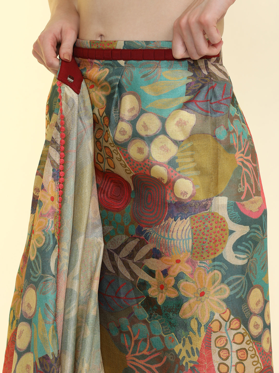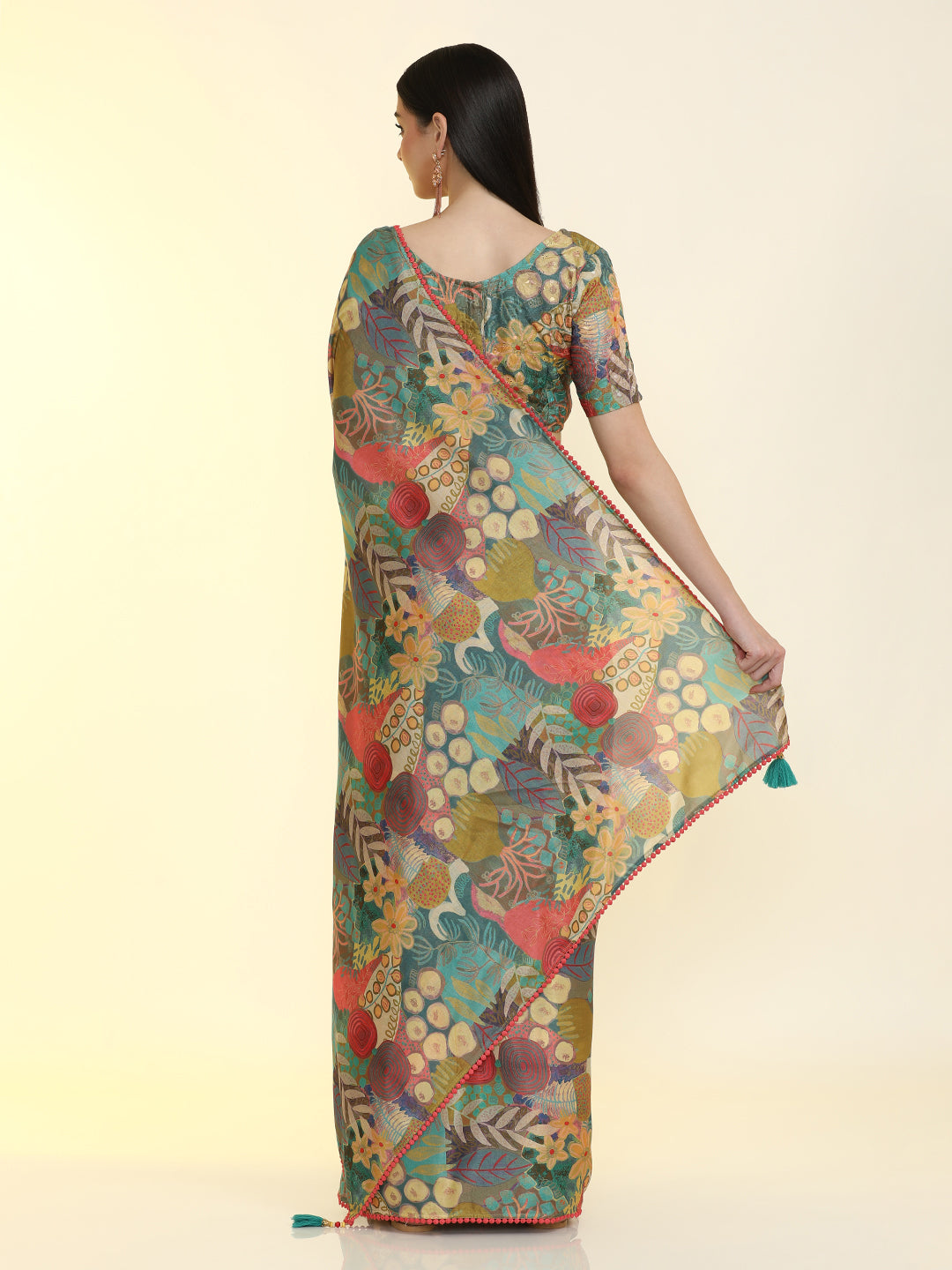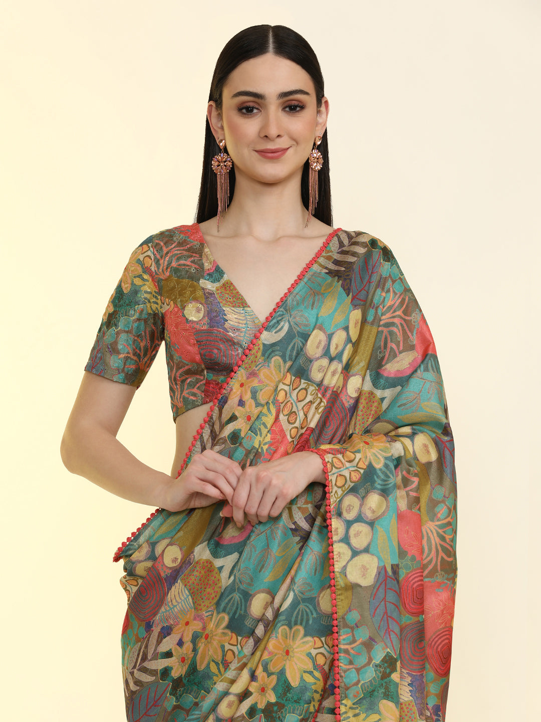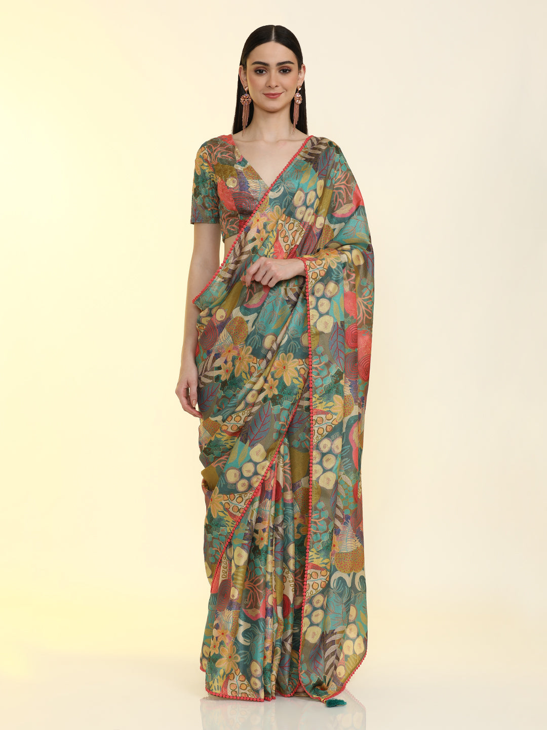 Introducing our Green Tussar Silk Tropical Printed Ready-to-wear Saree. It has colorful tropical prints, pre-stitched front pleats with hook adjustable waist and lace details. It comes with an unstitched tropical printed blouse piece.