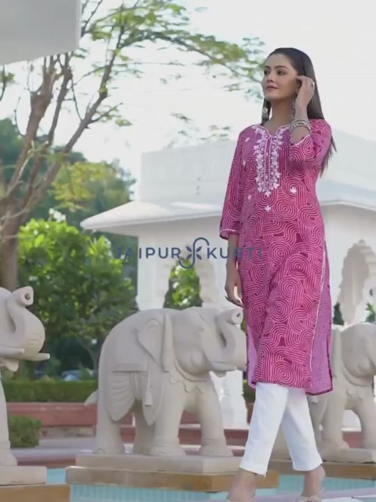 Red Color Geometric Ditigal Printed Muslin Kurta With Mirror Embroidered Neck, Has Three-Fourth Sleeves, Side Slits, Straight Hem And A Round Neck With A Slight V Openining, White Cotton Regular Fit Pants Has Both Side Pocket And Partially Elastic At Waist