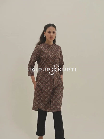A versatile fit, this Sand Grey Ethnic Printed Short Kurta has three-quarter sleeves, pleated details, a mandarin collar and a front button placket.