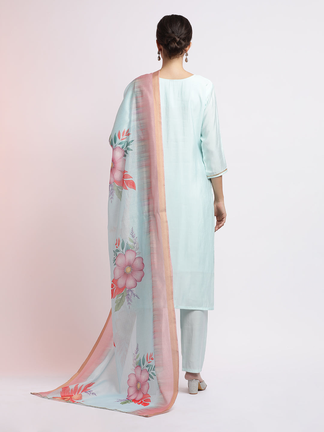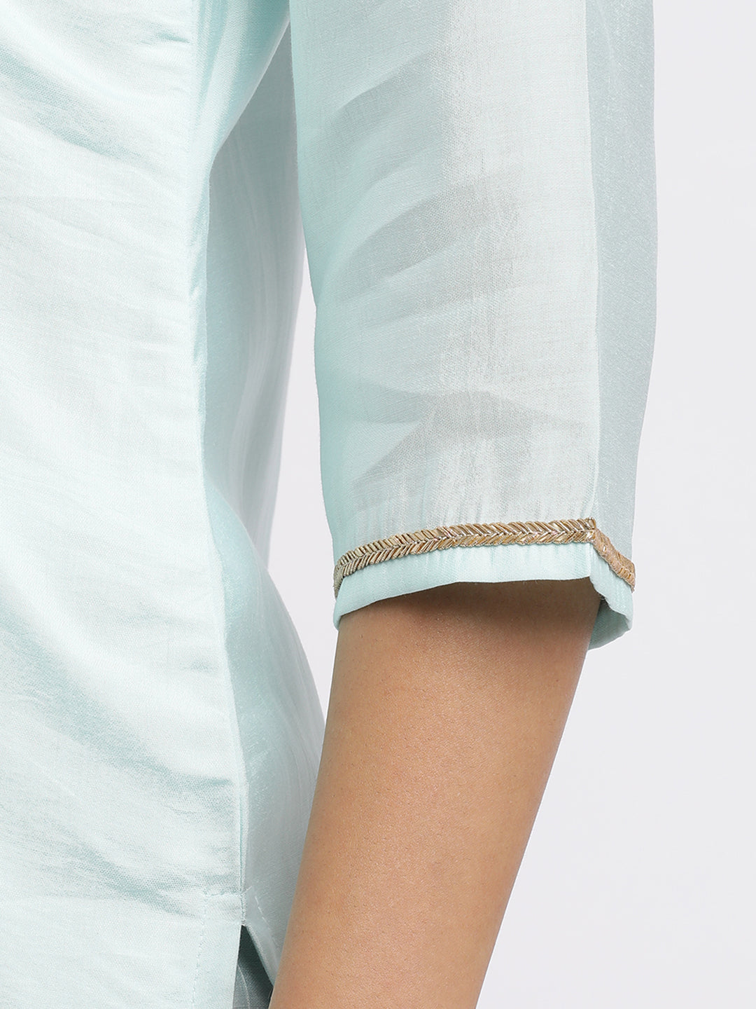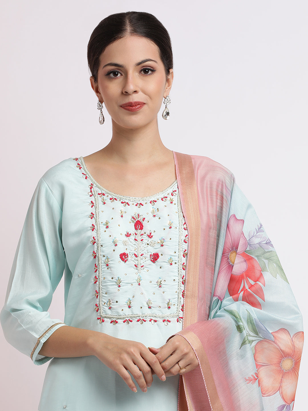 Embrace elegance with this Sea Green Embroidered Cotton Blend Kurta Set With Dupatta. The kurta has a boat neck with stone and beadwork embroidered yoke, three-quarter sleeves and a straight hemline. It is paired with a solid pyjama and a woven design jacquard dupatta.