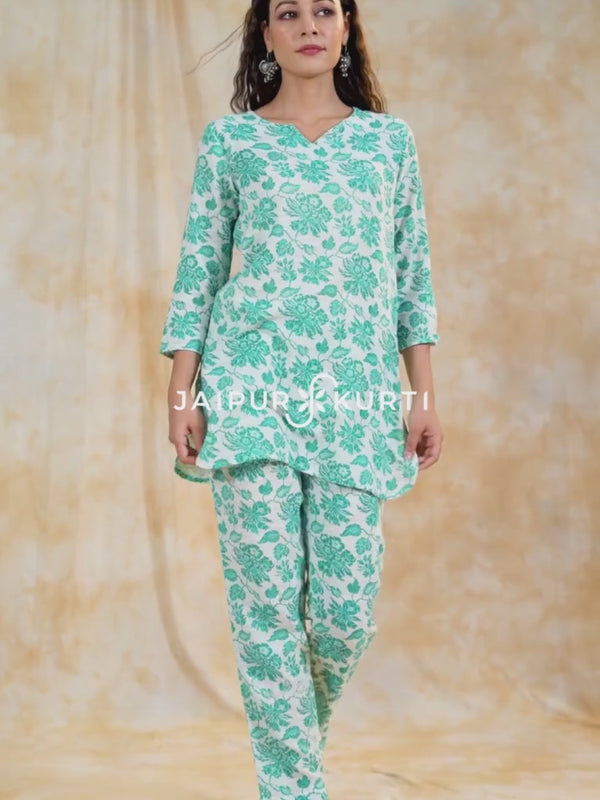 Snooze In Style With This Sea Green Floral Printed Cotton Loungewear. This Cotton Set Comes With A Short Three-Quarter Sleeves Kurti With A Round Hemline And Regular-Fit Pants
