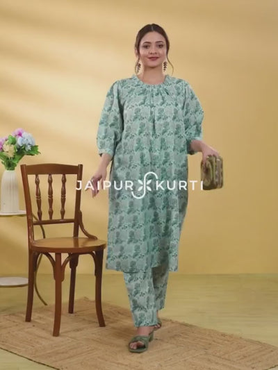 Indulge in refreshing floral blooms with our Sea Green Loose Fit Kurta with Pants. The a-line kurta features a pleated round neck with beadwork details, three-quarter puffed sleeves and a loose fit. Paired with relaxed-fit pants which have a partially elasticated waistband.