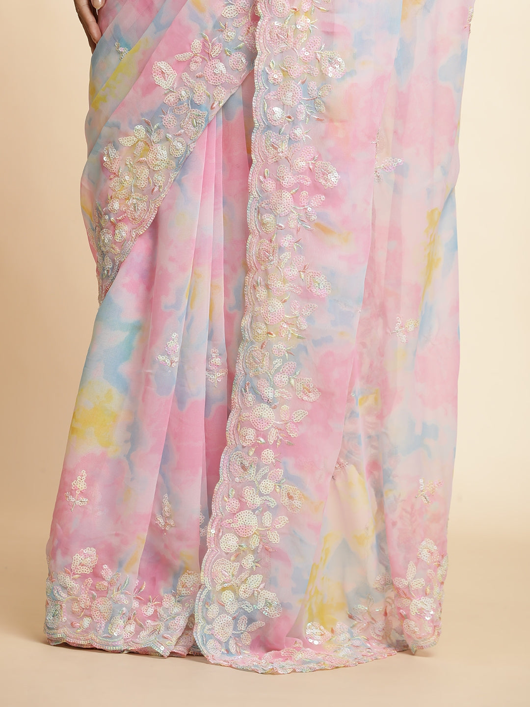 This Sequin Embellished Georgette Heavy Saree has heavy sequin embellishments and shades of blue tie-dye pure georgette fabric and it is lightweight. Disclaimer: The blouse worn by the model is for styling purposes only, this saree comes with an unstitched blouse piece.