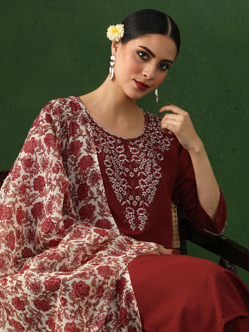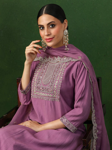 Solid Embroidered A-Line Chinon Kurta & Trousers Sets