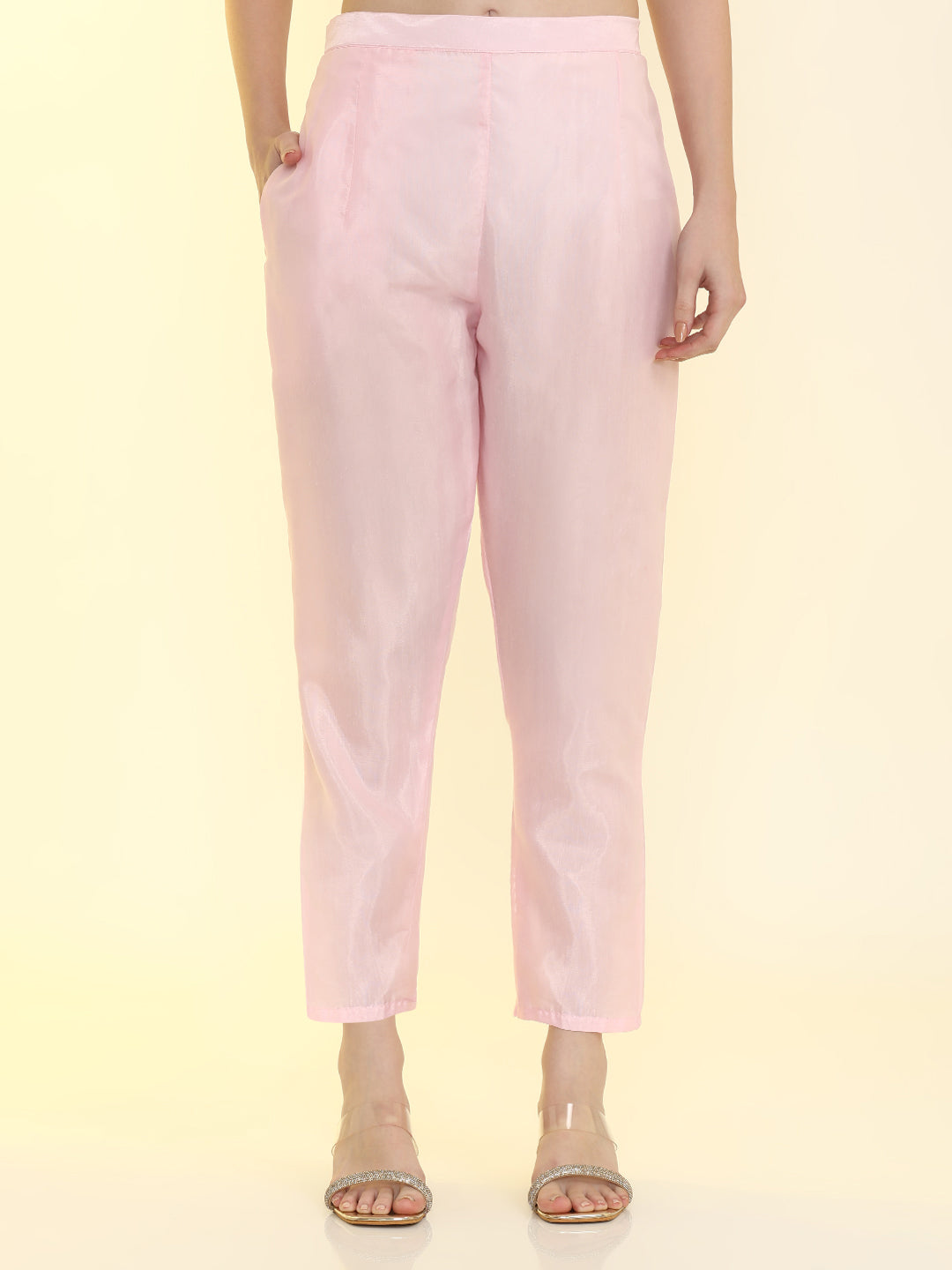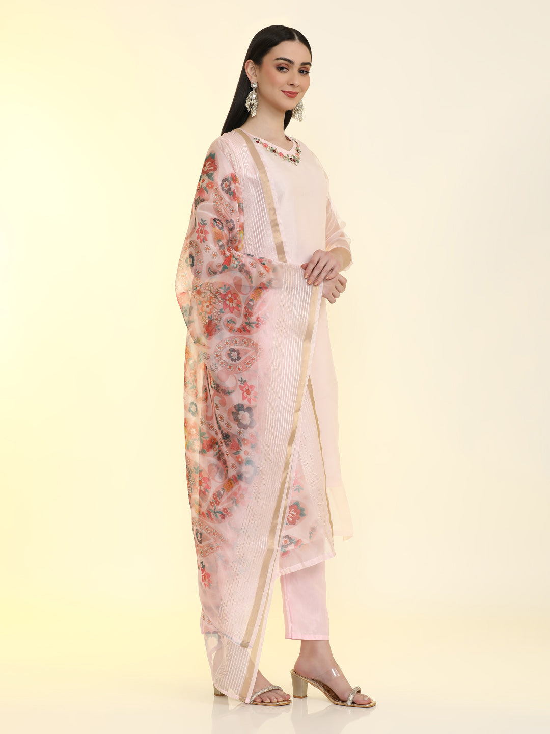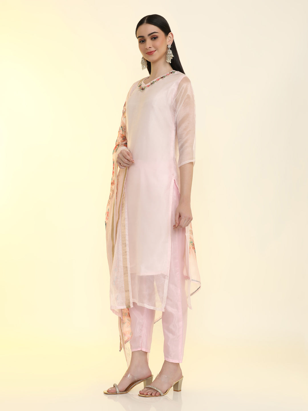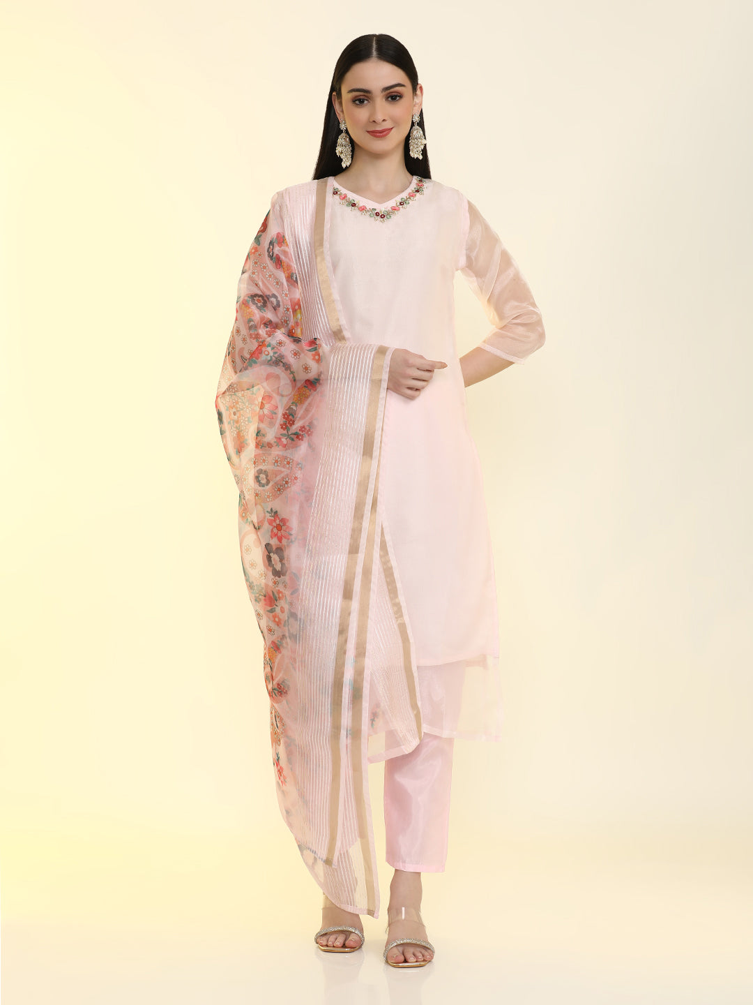 Embrace a comforting style with this Solid Embroidered Organza Pink Kurta Set. This Straight Kurta For Women has a V-Neck, Three-Quarter Sleeves With Mirror Work. Paired With a Trousers.