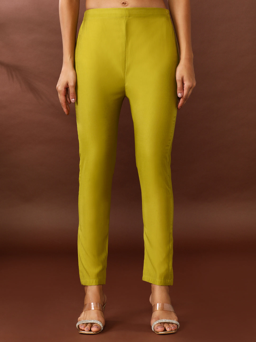 Embrace a comforting style with this Solid Embroidered Poly Silk Lemon Kurta Sets. This Straight Kurta For Women has a Round Neck, Three-Quarter Sleeves With Beads and Stones. Paired With a Trousers.