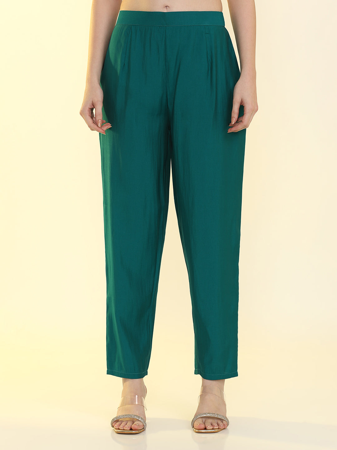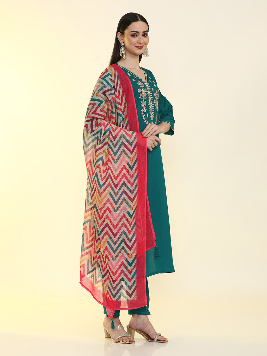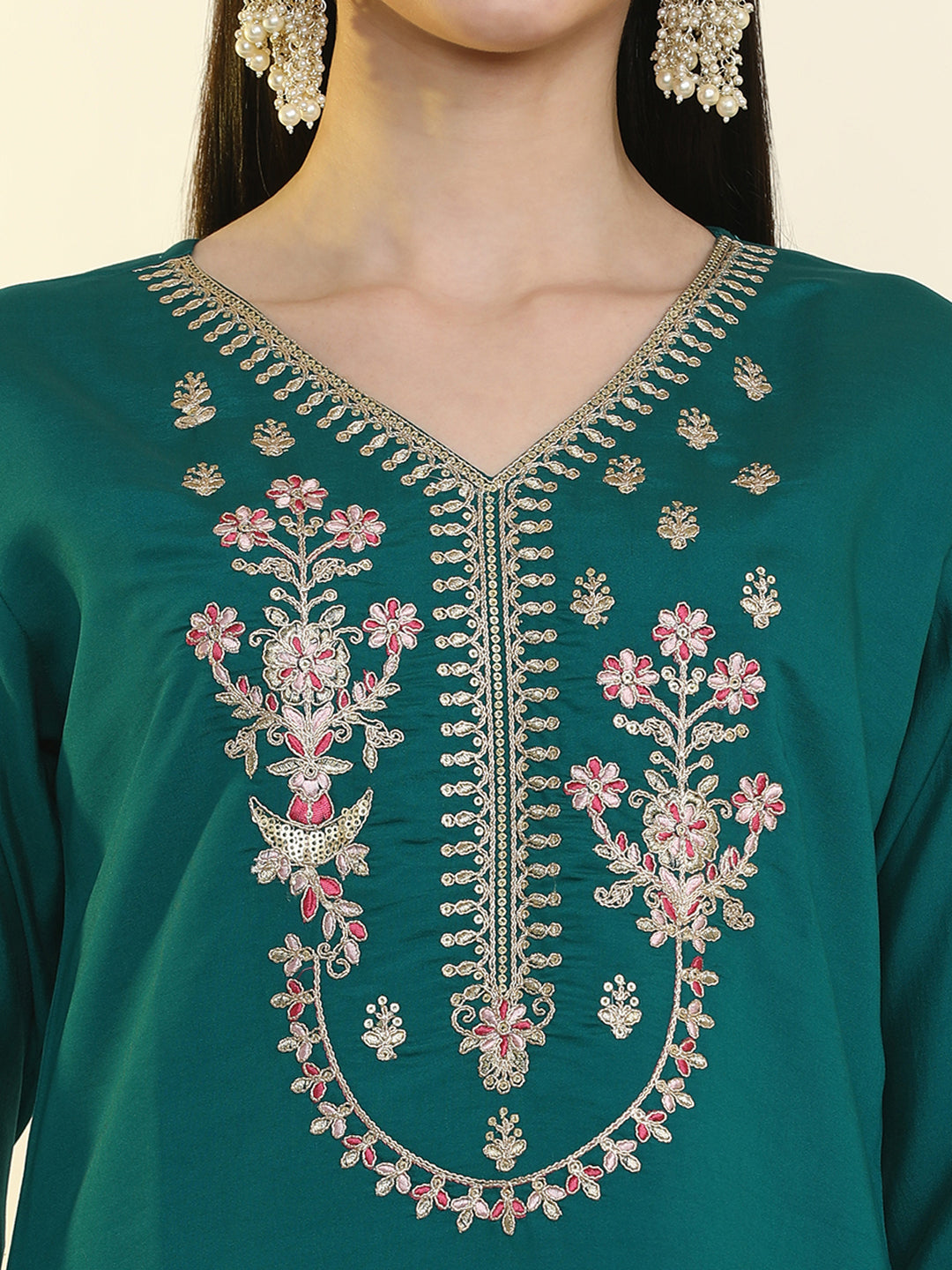 Embrace a comforting style with this Solid Embroidered Chanderi Silk Green Kurta Set. This Straight Kurta For Women has a V-Neck, Three-Quarter Sleeves With Thread Work. Paired With a Trousers.
