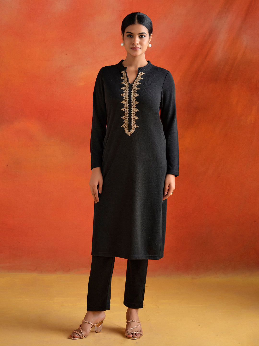Carry a versatile look in the winter season in these Black Straight Fit Solid Woolen Knitted Pants. It has an elasticated waistband and side pockets.