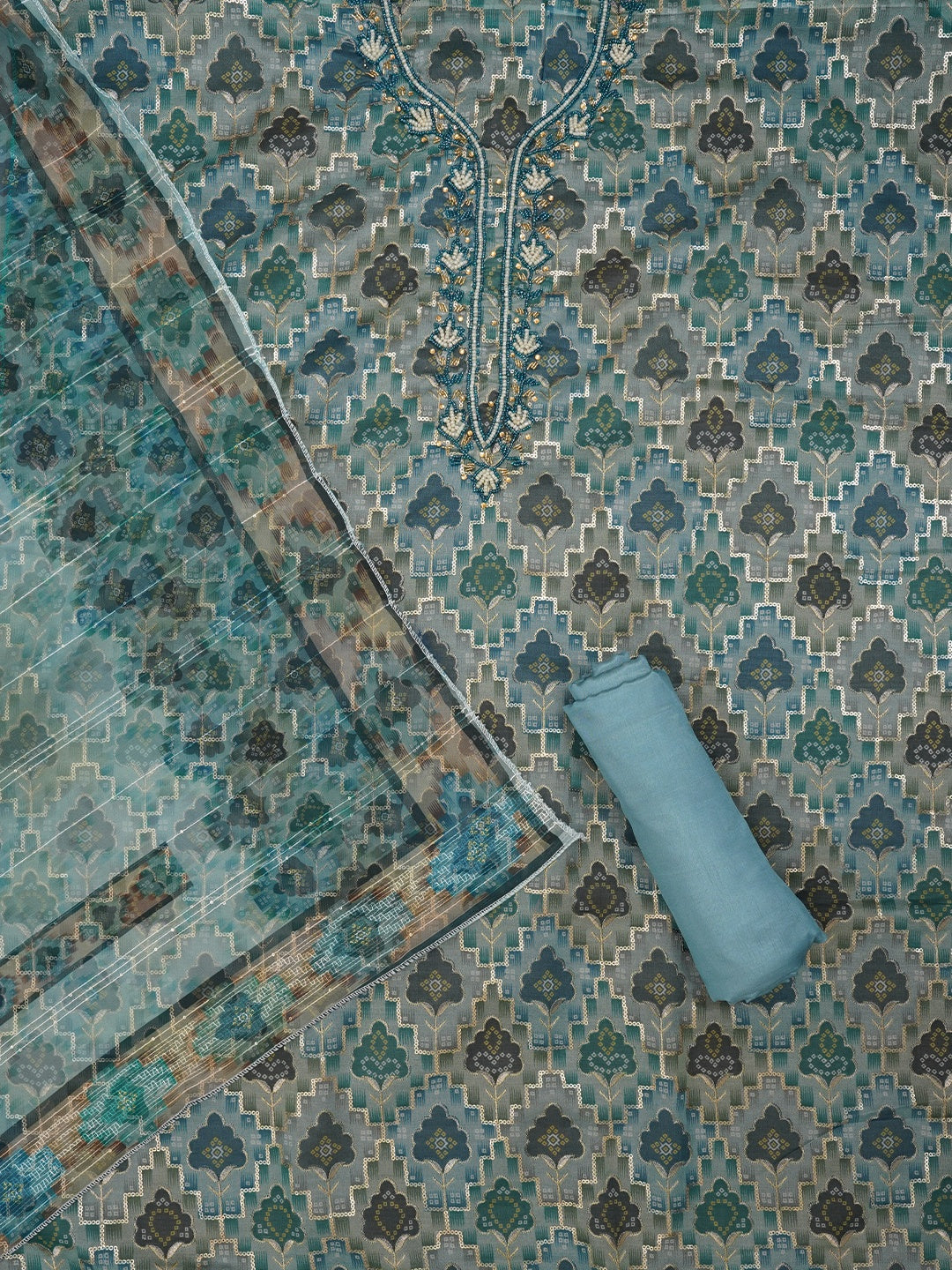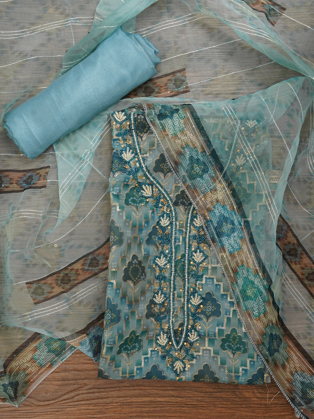Teal Ethnic Sequin Embroidered Organza Dress Material with Dupatta