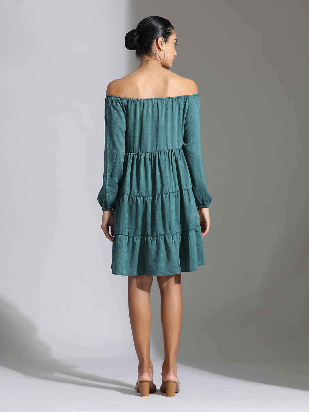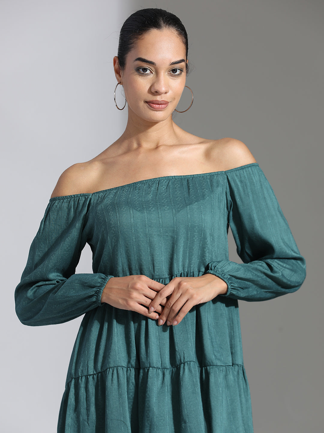 A cute addition to your wardrobe, this Party Wear Tiered Flared Dress. It is off-shoulder, elasticated full sleeves and a flared silhouette.