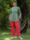 Women Teal Cotton Printed Short Kurta Has Round Neck With Slit , Three Fourth Sleeves, Side Slit, Round Hem,Pink Solid Loose Pants Has Both Side Pockets And Fully Elastic At Waist.