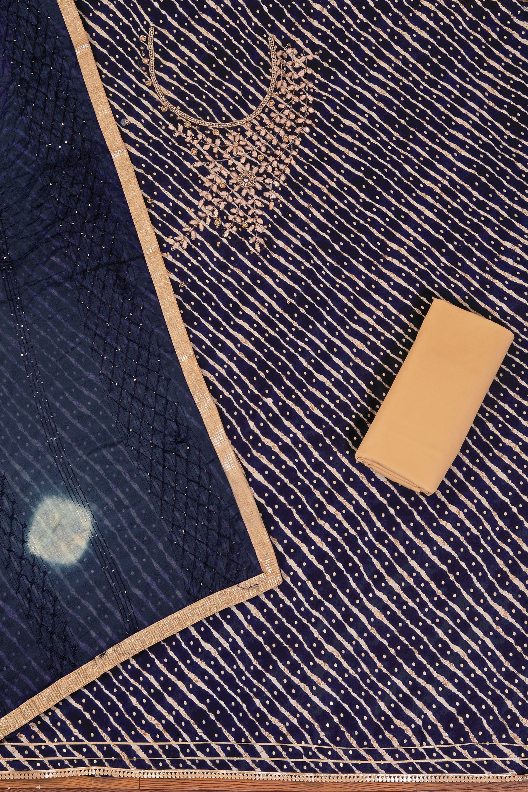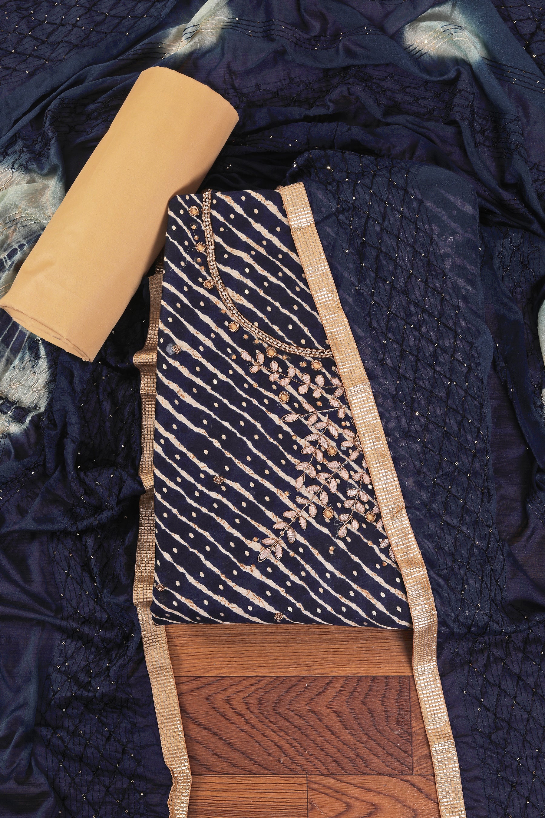 Make a festive statement in this Cream Unstitched Embellished Cotton Blend Dress Material With Dupatta. The kurta fabric has stone and beadwork details, the bottom fabric is solid and the dupatta has woven ethnic designs and tie-dye dupatta.