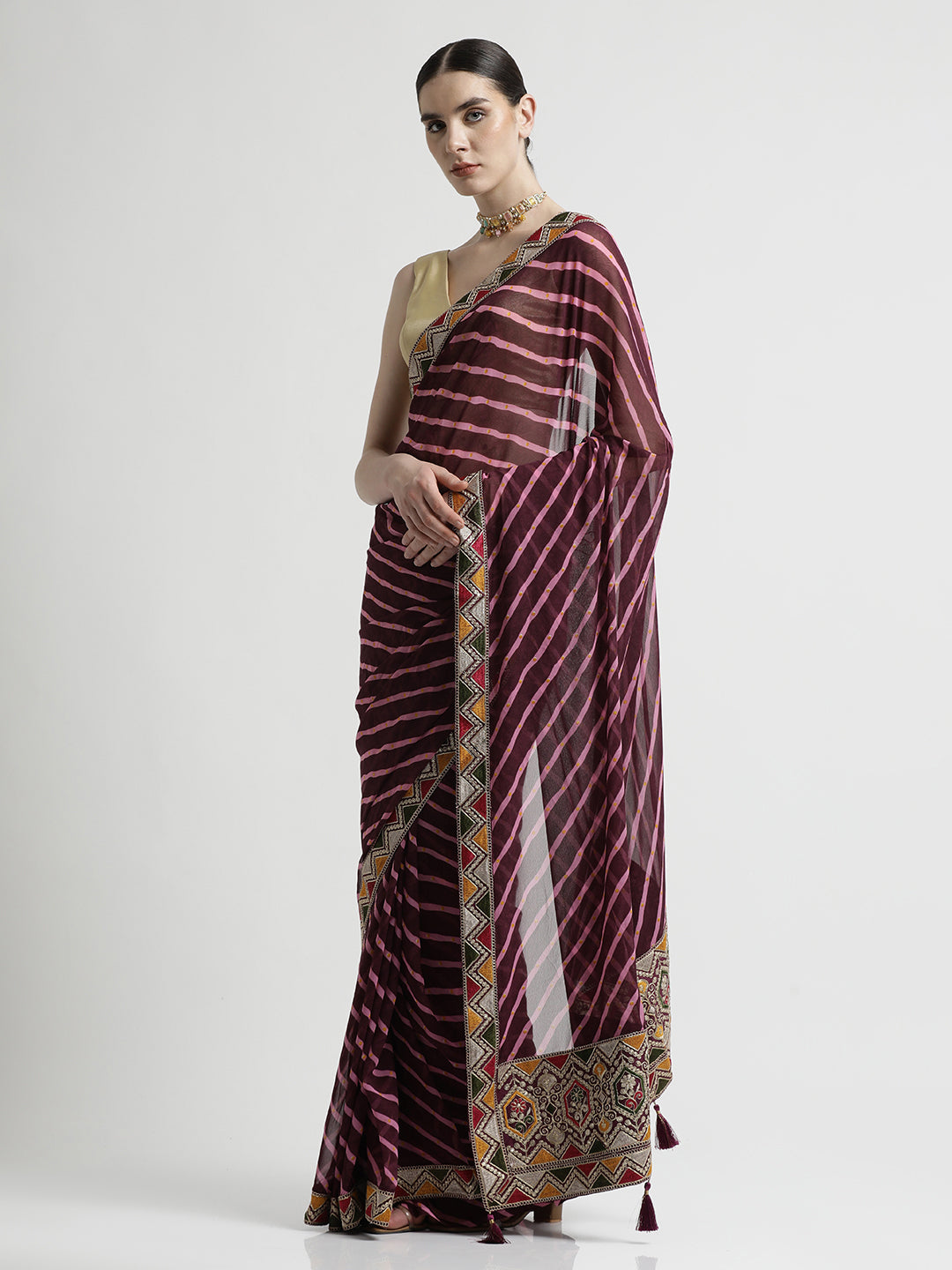 Give a traditional touch to your wardrobe with this Leheriya Embroidered Pure Georgette Saree. It has embroidered lace on borders and tassels at the hems.