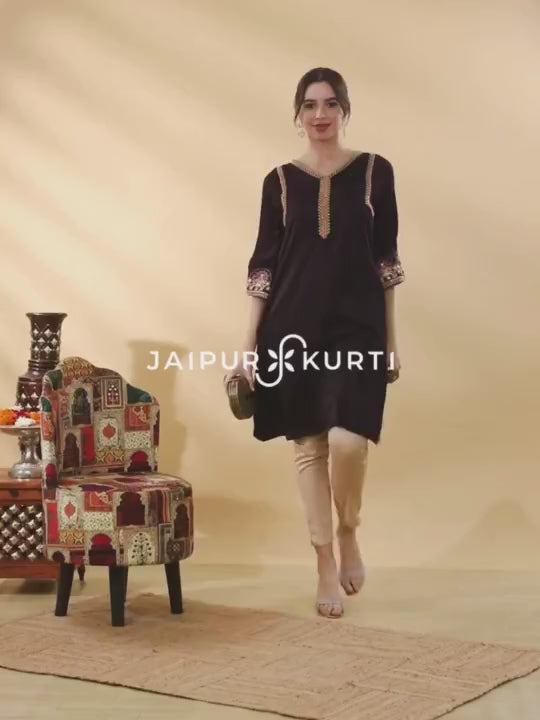 Add this classic and warm Wine Zardozi Pakistani Velvet Kurta to your winter closet to make a statement. It features a v-neckline, zardozi embroidered details, three-quarter sleeves and Pakistani A-line silhouette.