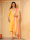 Women Yellow Self Weave Chanderi Kurta Has A Round Neck With Front Yoke Gota Patti And Mirror Work, Three Fourth Sleeves Has Gota Lace At The Hem, Side Slit, Lining Is Attached To Kurta , Yellow Solid Chanderi Pants Has Regular Hem With Both Side Pocket And Partially Elatic At Waist, Lining Is Attached To Pants And Chanderi Yellow And Peach Dupatta.
