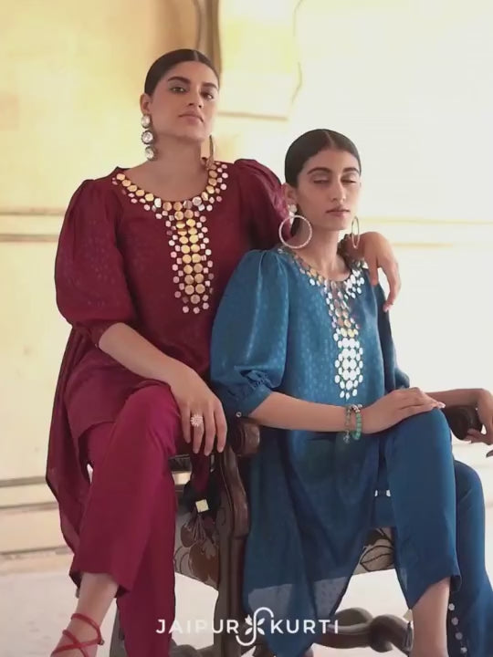 Look sophisticated and timeless with this exclusive Maroon Handkerchief Mirror Embellished Silk Top With Mirror Embellished Trousers. Crafted from the most luxurious silk fabrics, The teal top features an asymmetrical hemline with tassels on the edges, mirror embellishments with threadwork on the yoke, three-quarter puffed sleeves with button closure on the cuff. Paired with matching silk blend maroon pants with mirror embellishments on the side panel, side pockets, and a partially elasticated waistband.