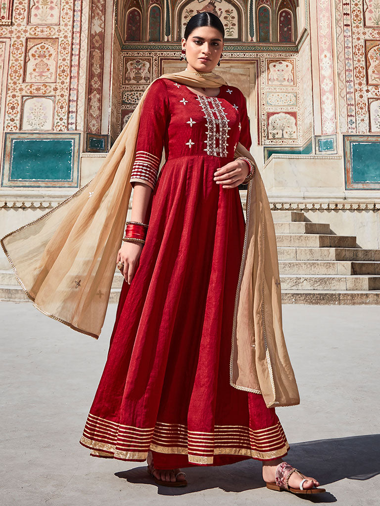 Women Maroon Silk Blend Dobby Anarkali Kurta Has A Round Neck With Embroidered Yoke,3/4Th Sleeves Has Gota Work And Gota Laces With Peach Piping, Flared Hem Has Gota Laces On The Hem,Shantoon Cotton Linning Attached To Kurta, Organza Beige Embroidered Dupatta.