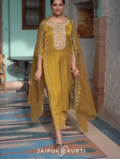 Women Mustard Straight Silk Blended Kurta With Round Neck ,Hand Embroided Yoke And All Over It, 3/4Th Sleeves Has Work At Hemline, With Shantoon Lining, Side Slit And Straight Kurta Solid Mustard Silk Blend Palazzo Has Both Side Pocket And Partially Elastic At Waist And Organza Mustard Dupatta Has Embroided All Over It.