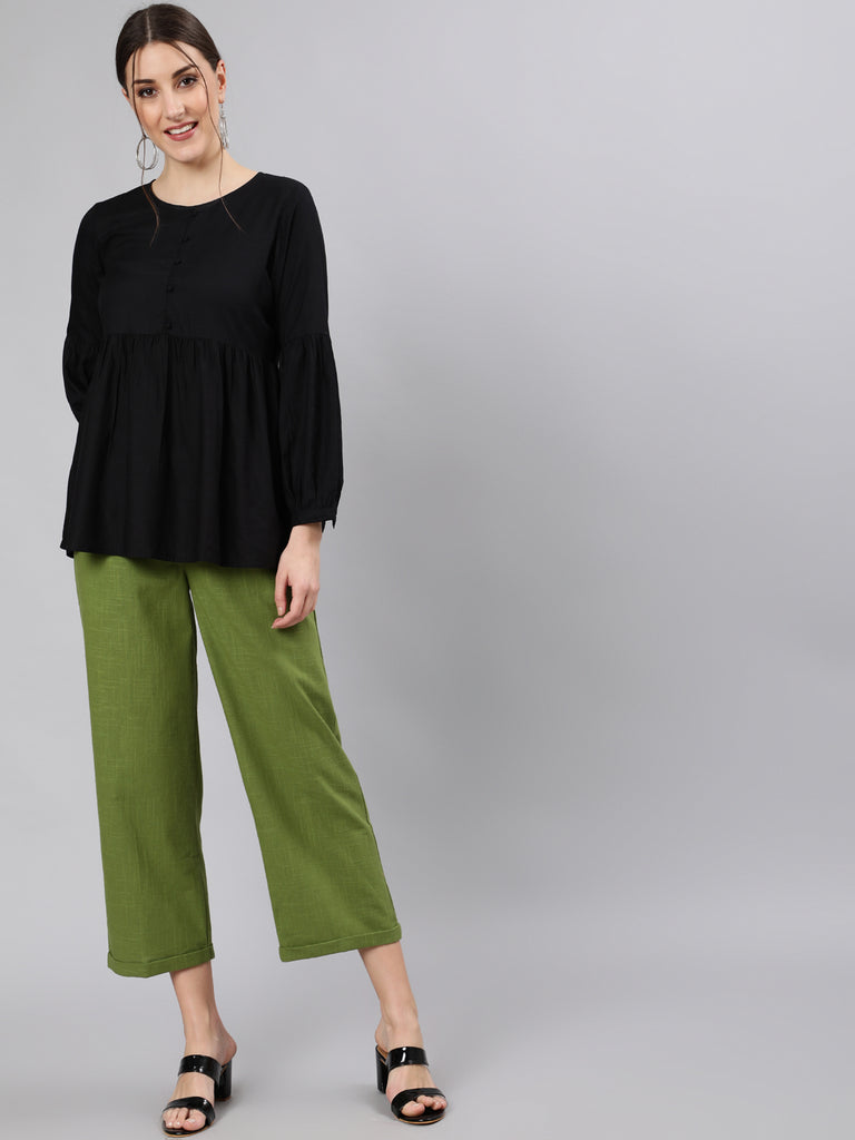 Olive Cotton Slub Straight High Rise Bottom-Fold Pants