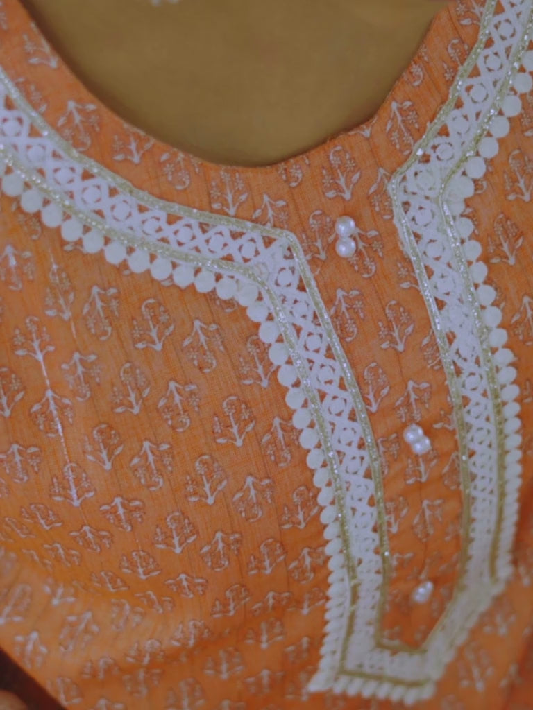This rayon slub kurta for women comes in orange color with gold prints. It has a round neck design with crochet lace, gota lace, and buttons on the neck and sleeves hem. The three-fourth bishop sleeves have laces, and the side slit has a straight hem. The front placket has buttons, and the viscose rayon printed palazzo has crochet and gota lace with pockets on both sides. It also has an elastic hem.