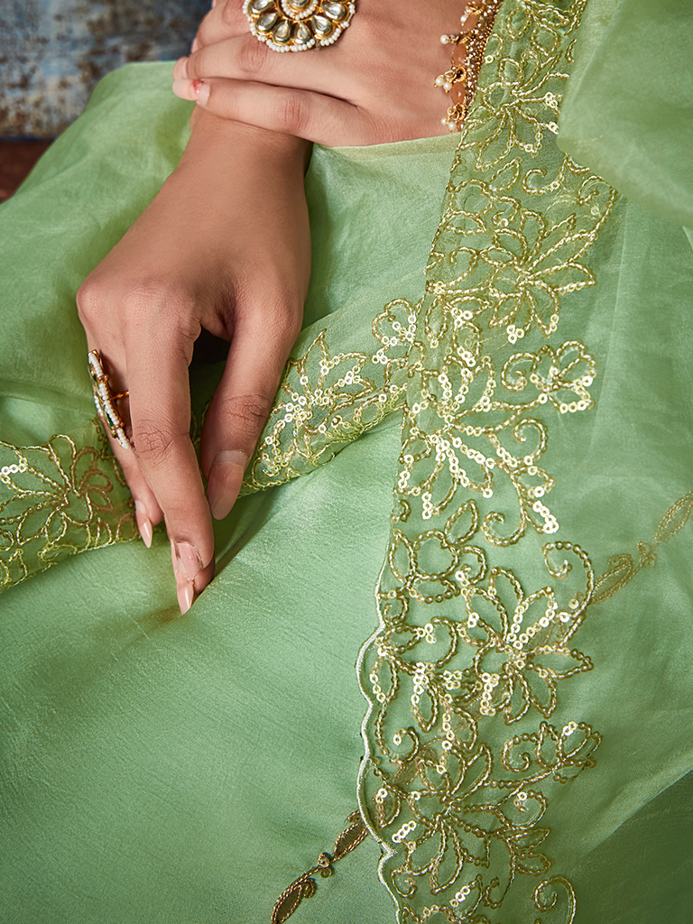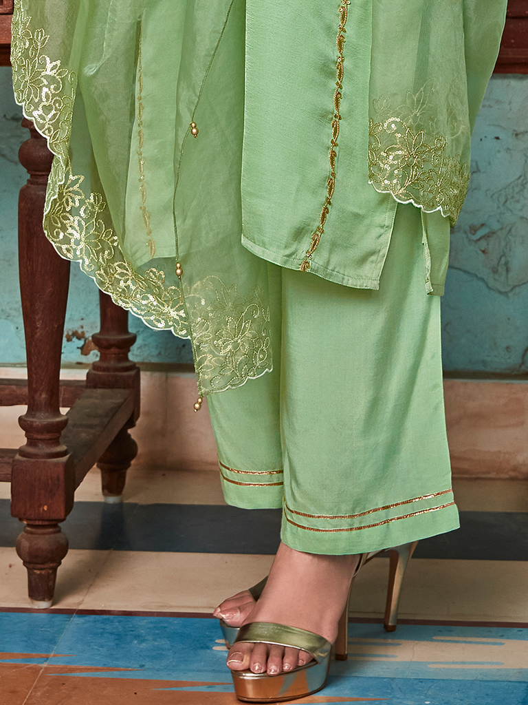 Pista Green Straight Embroided Silk Kurta With Palazzo And Organza Embroidered Dupatta