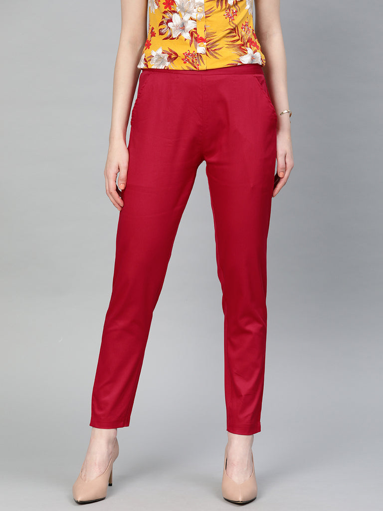 Embrace an elegant style in these Red Cotton Lycra Pants with a partially elasticated waistband and both side pockets. The stretchable lycra fabric makes it a versatile choice for every occasion.