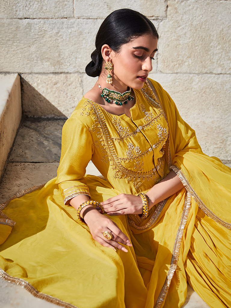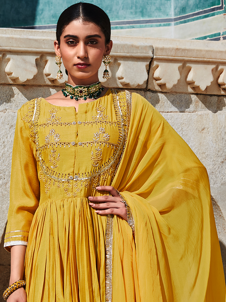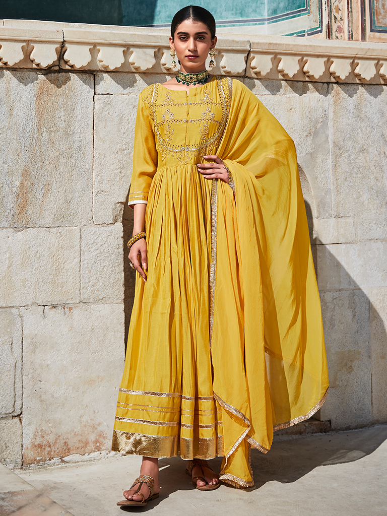 Women Yellow Zardozi Work Floor Length Anarkali Kurta Has Round Neck With Front Yoke Zardozi Work And Placket For Opening, Gathers At Waistline With Gota Laces All Over The Hemline, Three Fourth Sleeves With Organza Embellished Dupatta Has All Over Hand Work And Laces.