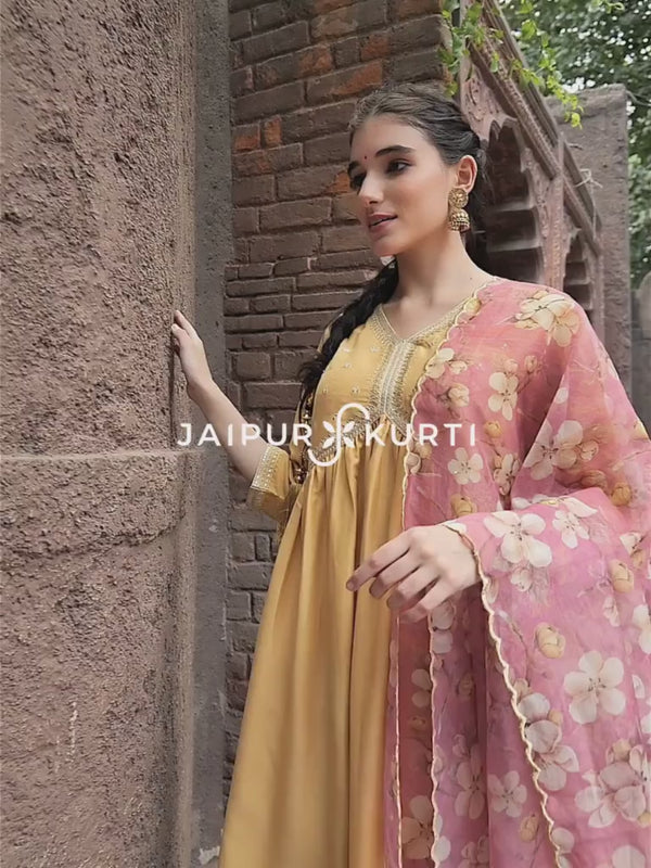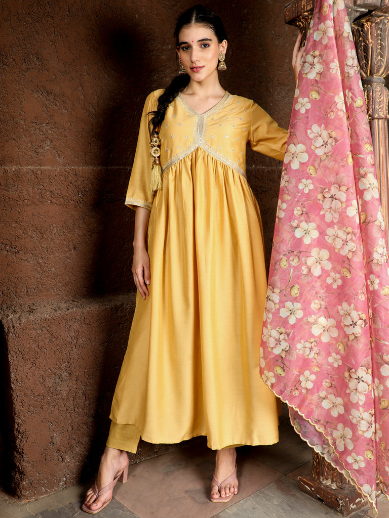 Yellow Art Silk Flared Kurta With Floral Printed Organza Dupatta will enhance your style. It is made of the finest art silk fabric and has an enticing aari work on the front yoke and hemline of the three-quarter sleeves. It has a V-neck and is paired with a floral printed organza dupatta with scallops on the edges.