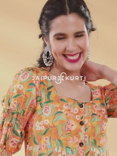 This Yellow Floral Printed Rayon Straight Kurta is ideal for every season. It is based on a classical essence, yet its vivid color catches the zeitgeist. The versatile square neck, three-quarter rushed sleeves, and buttons down the front placket perfectly complement the garment.