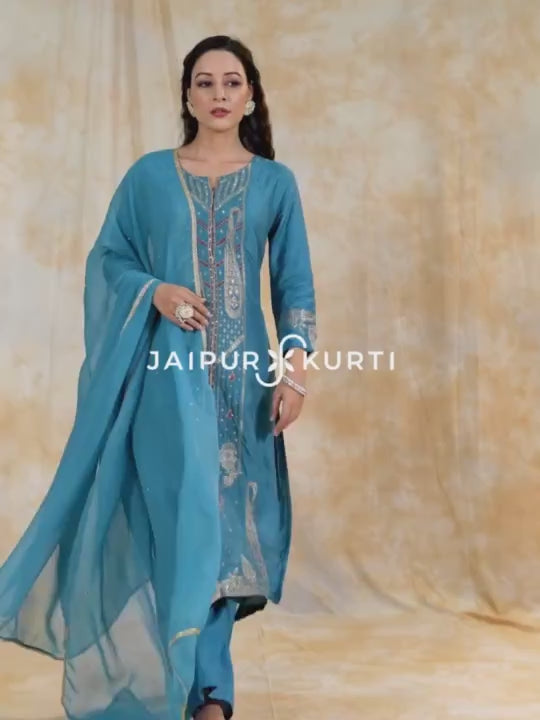 Zardozi Embroidered Silk Teal Blue Straight Kurta With Palazzo And Dupatta